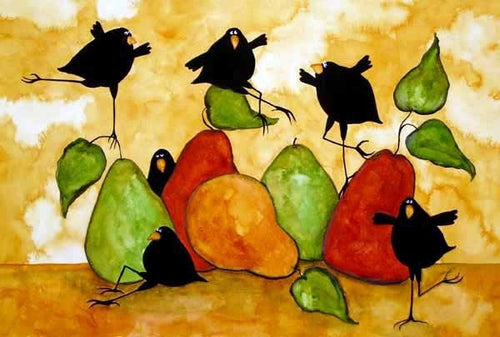 Pear Party by Debi Hubbs blackbirds crows fruit kitchen art decor whimsical folk art